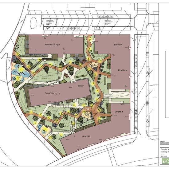 Rauðbrúnar steyptar stéttir liggja um garðinn og við þær verður lýsing. Í honum verða reiðhjólagrindur og þrjú mismunandi leiksvæði fyrir börn. Í garðinum verður gras, runnar og trjágróður í miðlungshæð, trépallar ásamt regnbeðum.